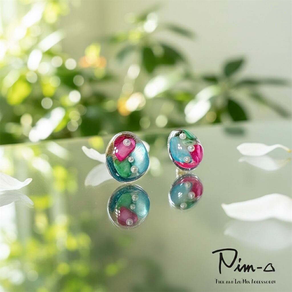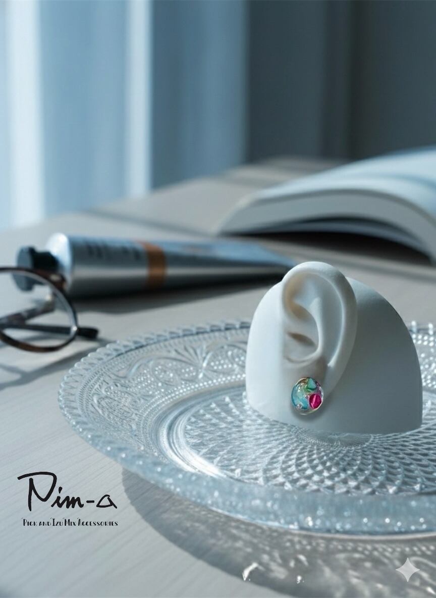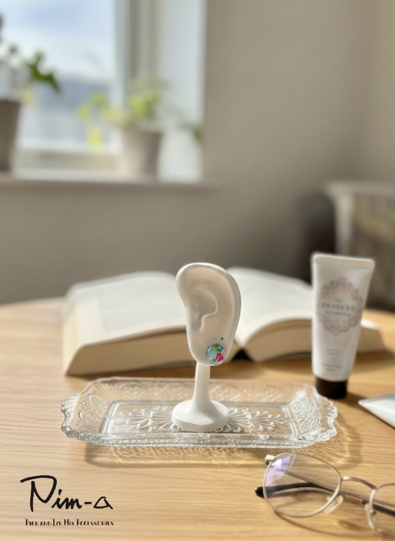 ピアスの透明感とシェルの色がパッと映え、顔まわりをパッと明るく、みずみずしい印象に仕上げてくれます。